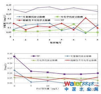 污水中各種形態(tài)磷的比例對于TP達標影響較大。通過試驗發(fā)現(xiàn),出水中可化學沉淀去除磷和可絮凝沉淀去除磷濃度較低,在0.05-0.15mg/L之間,而溶解性不可化學去除磷濃度波動范圍在0.06-0.2mg/L之間?梢员WC物化深度處理出水TP標。