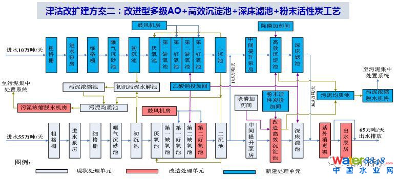 對TP和SS的去除工段:維持現(xiàn)有高效沉淀池+深床濾池的處理工藝,降低設計負荷。