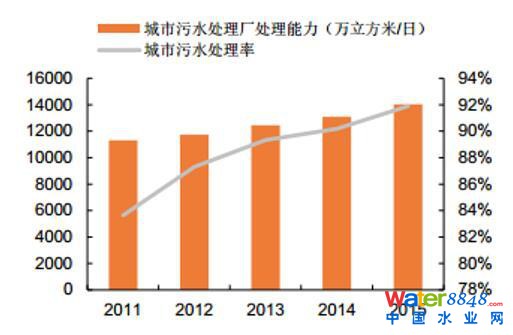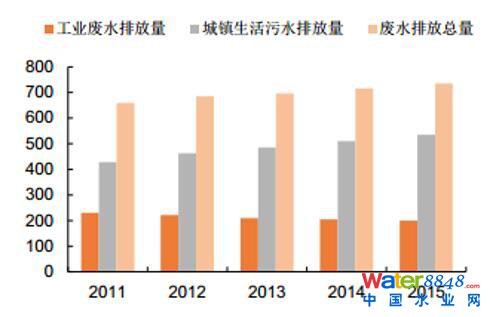 水 污染現(xiàn)狀與工業(yè)廢水、城鎮(zhèn)生活污水排放密切相關(guān)。2011年以來我國廢水排放總量呈上升趨勢,污水治理需求不斷提升;趯λh(huán)境的深切擔(dān)憂,加強水污染防范與城鎮(zhèn)污水治理被列為“十三五”期間環(huán)境治理的重點內(nèi)容。現(xiàn)有污水處理廠的提標改造以及污水處理廠的新建要求將推動行業(yè)迎來収展黃金期。2011-2015年,我國工業(yè)廢水排放量逐年減少,城鎮(zhèn)生活污水排放量逐年增加。2015年,全國廢水排放總量為735.3億噸,其中工業(yè)廢水排放量為199.5億噸,城鎮(zhèn)生活污水排放量為535.2億噸。根據(jù)住建部最新數(shù)據(jù),2015年底我國共有1943座城市污水處理廠,處理能力為1.41億立斱米/日,城市污水處理率達91.9%。