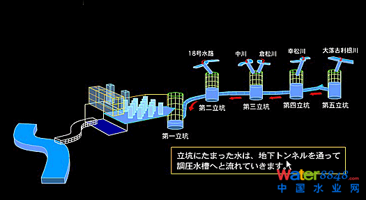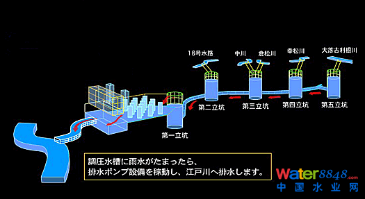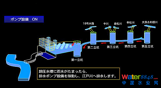 注:當調(diào)壓水槽內(nèi)儲存了一定水量之后,排水泵打開,雨水迅速排向江戶川。