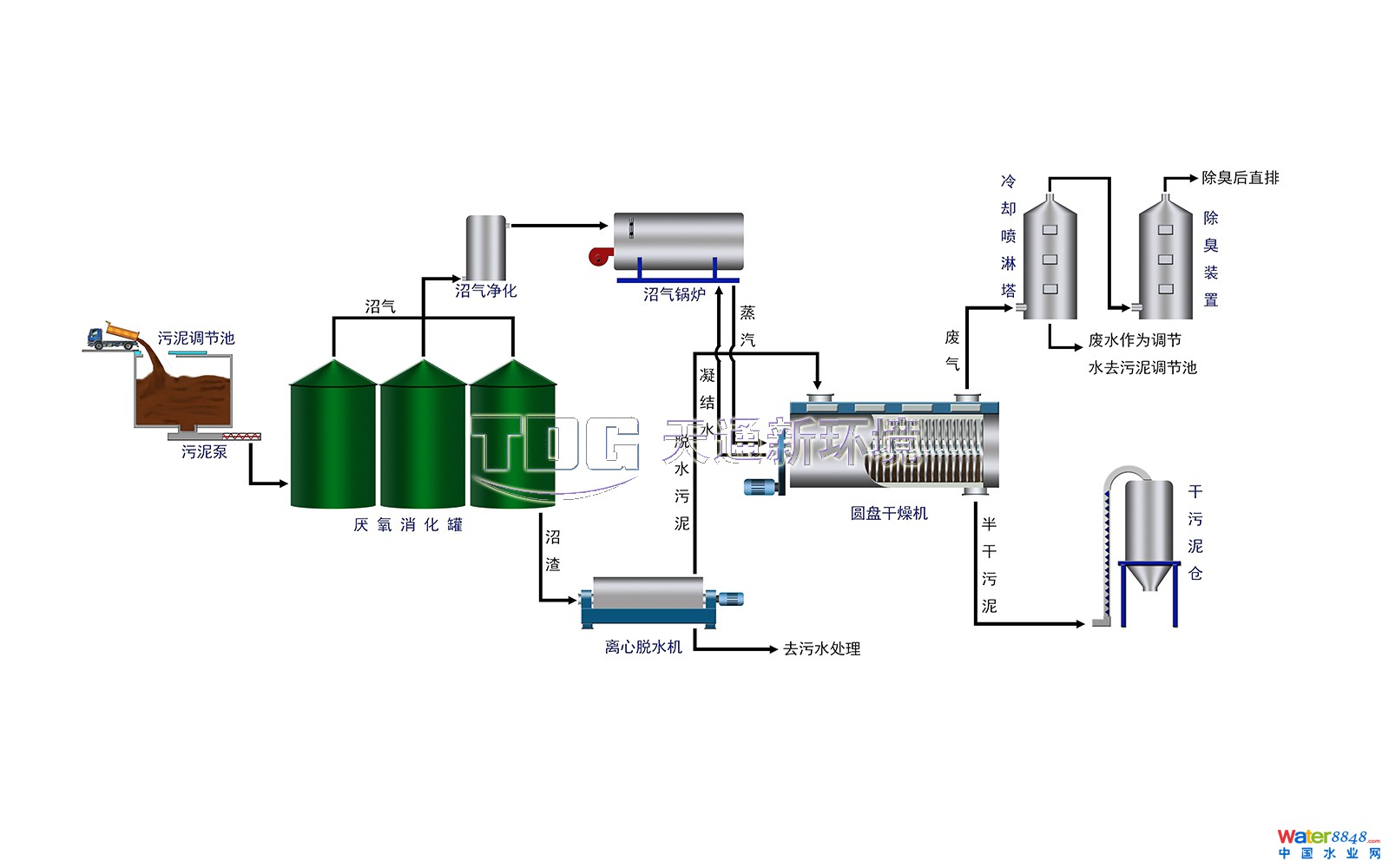 處置的工藝方案。該系統(tǒng)包括兩個(gè)核心工段,一是污泥的厭氧消化系統(tǒng),其二是沼渣的熱