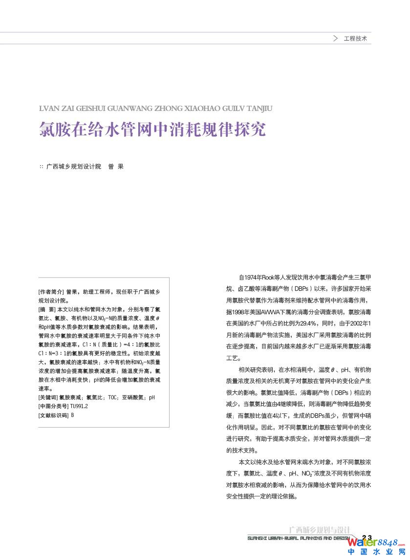 核心提示: 氯胺在給水管網(wǎng)中消耗規(guī)律探究 廣西壯族自治區(qū)城鄉(xiāng)規(guī)劃設(shè)計(jì)院