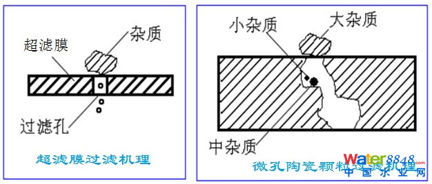 這是過(guò)濾截留原理示意圖,左圖表示超濾由固定孔徑機(jī)械截留,截留的雜質(zhì)在表面堆積,小于孔徑的雜質(zhì)會(huì)透過(guò)膜,液體的過(guò)濾路徑只有0.1微米。過(guò)濾精度越高則孔徑越小,但是推動(dòng)力也越大,而節(jié)能微濾的過(guò)濾路徑是超濾路徑的數(shù)千倍,更多的截留雜質(zhì)不僅僅是在表面,而是在濾層和微孔之中,深長(zhǎng)的過(guò)濾路徑彎彎曲曲,路徑的寬度忽大忽小,同時(shí)由于對(duì)顆粒表面的改性處理,不同的改性表面能夠?qū)Σ煌碾s質(zhì)具有吸附作用,從而使得較小的雜質(zhì)難以穿透濾層,初期截留的雜質(zhì)進(jìn)一步增加了濾料的表面積,從而可以截留更多更小的雜質(zhì),稱之為以渣濾渣。
