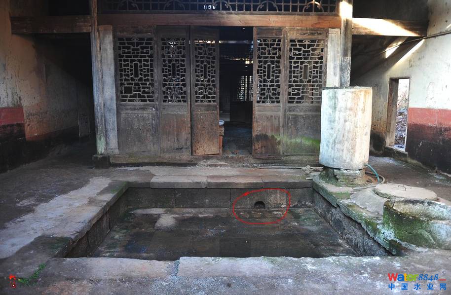 • 天井在大屋正廳兩側(cè)各有一個(gè),每個(gè)天井正下方都用石板砌有蓄水池。每逢下雨,雨水順著屋檐流進(jìn)蓄水池,水可以日常家用,也可以用來(lái)做消防用水。若遇大雨或連陰雨,水池水滿,則可以打開水池側(cè)面的排水洞(圖中紅圈處)讓水通過(guò)暗溝流出室外。