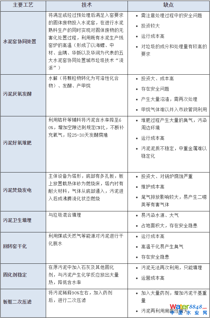污水處理流程中將產(chǎn)生大量的污泥,污水處理程度越高,就會產(chǎn)生越多的污泥殘余物,需要加以處理。一般的污水處理廠必須設(shè)有污泥處理設(shè)施。對現(xiàn)代化的污水處理廠而言,污泥的處理與處置已成為污水處理系統(tǒng)運行中最復(fù)雜、且花費最高的一部分。以下表格梳理了污泥處理處置的7種主要工藝技術(shù)。