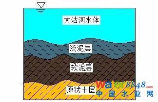 A河道及兩條支流全長81.6km,自1965年改造至今,40余年來一直是某城市南部區(qū)域主要工業(yè)廢水、生活污水及污水處理廠尾水的排放通道。目前,該河道斷面逐年減小,河底淤泥深達(dá)1-2m,沿河構(gòu)筑物損壞嚴(yán)重且規(guī)模不足。對該河道水流及底泥進(jìn)行調(diào)查,水質(zhì)氨氮達(dá)125mg/Kg,生化需氧量246mg/Kg,流泥層含水率50%-100%,軟泥層含水率38%-50%,原狀土層含水率33%,污染嚴(yán)重。