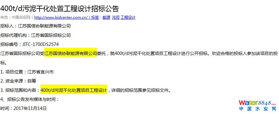 2017年底,江蘇國信協(xié)聯(lián)能源有限公司開展400t/d污泥干化處置工程項目設(shè)計公開招標(biāo)