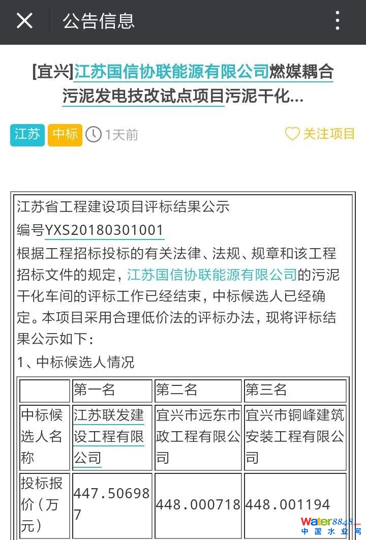 2018年4月,污泥干化車間評標(biāo)工作結(jié)束,第一名為江蘇聯(lián)發(fā)建設(shè)工程有限公司,報價447.506987萬元