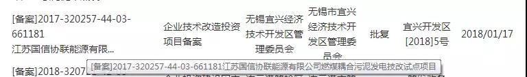 2018年1月,江蘇國信協(xié)聯(lián)能源有限公司燃煤耦合污泥發(fā)電技改試點項目完成“企業(yè)技術(shù)改造投資項目備案”宜興開發(fā)區(qū)[2018]5號