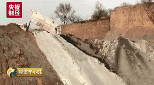 伴隨著發(fā)動(dòng)機(jī)的轟鳴聲,卡車(chē)的后斗被抬起,一整車(chē)白色工業(yè)廢渣被傾倒在一個(gè)巨大的深坑里,灰色和白色兩種工業(yè)廢渣沿著卡車(chē)停過(guò)的位置滾落至坑底,從遠(yuǎn)處看,好似兩種不同顏色的“瀑布”。