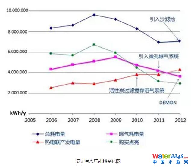 該污水廠所屬的水委會(huì)一直致力于改善能耗的研究,自2008年前污水廠的耗能持續(xù)減少,而由于沼氣產(chǎn)量提高熱電聯(lián)產(chǎn)的產(chǎn)電量也不斷增加。