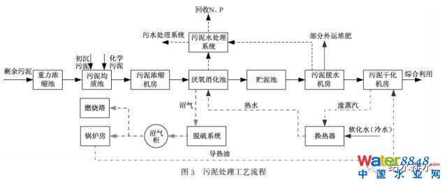系統(tǒng)穩(wěn)定運(yùn)行后,污泥消化產(chǎn)生的污泥氣用于污泥干化,污泥干化的余熱經(jīng)能量回收裝置回收用于污泥消化,實(shí)現(xiàn)污泥干化的能量平衡,不需要外加熱源。