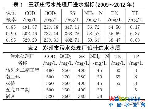 王新莊污水處理廠實(shí)際進(jìn)水水質(zhì)如表1所示,根據(jù)鄭州市其他污水處理廠的設(shè)計(jì)進(jìn)水水質(zhì),結(jié)合城市建設(shè)現(xiàn)狀和發(fā)展方向,特別是環(huán)境保護(hù)控制的要求,綜合確定鄭州新區(qū)污水處理廠設(shè)計(jì)進(jìn)水水質(zhì)如表2所示。