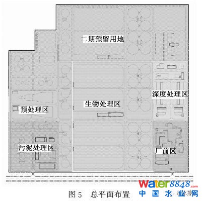 鄭州新區(qū)污水處理廠總平面布置分為4個(gè)區(qū):由西向東依次為:污泥處理區(qū)和預(yù)處理區(qū)、生物處理區(qū)、深度處理處理區(qū),廠前區(qū)位于廠區(qū)東南角,并預(yù)留二期用地,總平面布置如圖5所示。
