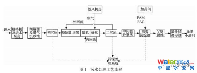 一期工程針對(duì)工程進(jìn)水濃度高、出水標(biāo)準(zhǔn)高的要求,采用了前置缺氧段改良A2/O工藝,污水處理工藝流程如圖1所示。