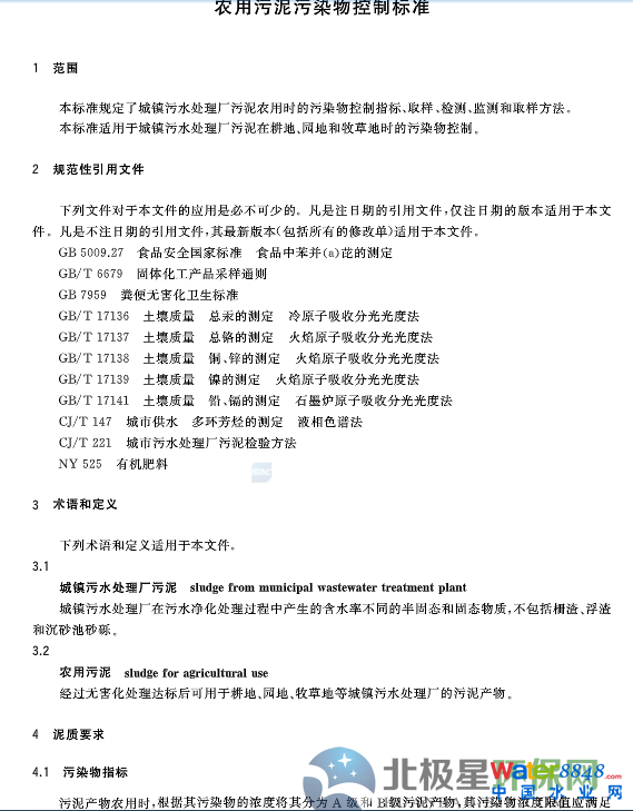 核心提示:全文|農(nóng)用污泥污染物控制標(biāo)準(zhǔn)(GB 4284-2018 ) 標(biāo)準(zhǔn)將于2019月6月1日實施。標(biāo)準(zhǔn)規(guī)定了城鎮(zhèn)污水處理廠污泥農(nóng)用時污染物的控制指標(biāo)、取樣、監(jiān)測、檢測和取樣方法。標(biāo)準(zhǔn)適用于城鎮(zhèn)污水處理廠污泥在耕地、園地和牧草地時的污染物控制。
