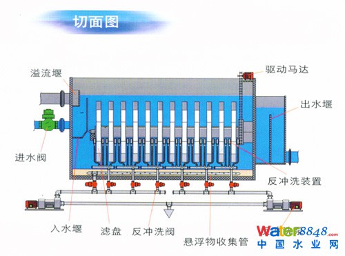 3、設(shè)計(jì)新穎,耐沖擊負(fù)荷。濾盤垂直設(shè)計(jì),過(guò)濾原理是錯(cuò)流過(guò)濾,相當(dāng)于是濾池及沉淀池的結(jié)合,顆粒大的污泥直接沉淀到斗形池底排掉,不像普通濾池所有的懸浮物(SS)都必須經(jīng)過(guò)濾料。因此纖維轉(zhuǎn)盤濾池更耐高懸浮物濃度和大顆粒懸浮物的沖擊。