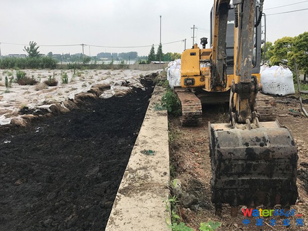 督察人員在南池西側(cè)看到停著一臺小型挖掘機(jī),幾十袋包裝好的污泥擺放在旁邊。泰興市工作人員介紹,正在將少量含水率較低的污泥裝袋,運(yùn)到危廢儲存場所暫存,最終安全處置。但是從現(xiàn)場情況看,挖掘工作才剛剛開始。