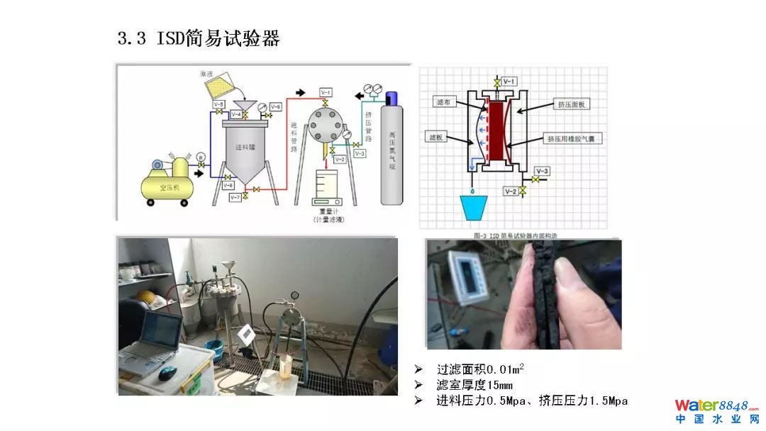 委托石垣公司開展ISD板框小試實驗(過濾面積0.01m2,單側(cè)擠壓單面過濾、濾室厚度15mm,模擬正常板框機進料壓力0.5Mpa(空壓機壓力)、擠壓壓力1.5Mpa(高壓氮氣),處理泥餅厚度提升至15mm,處理量大幅增加。