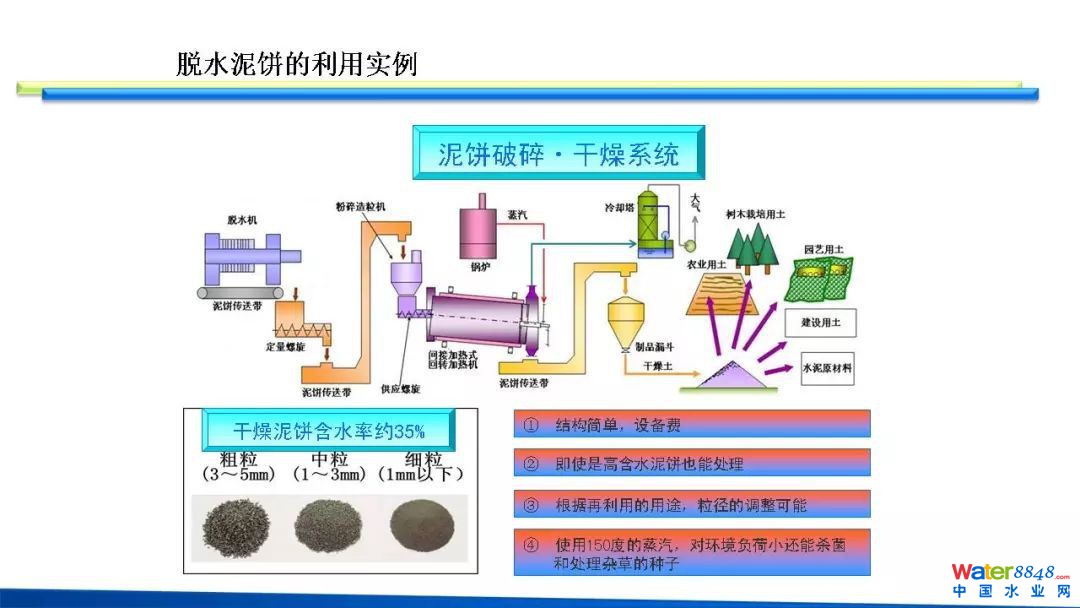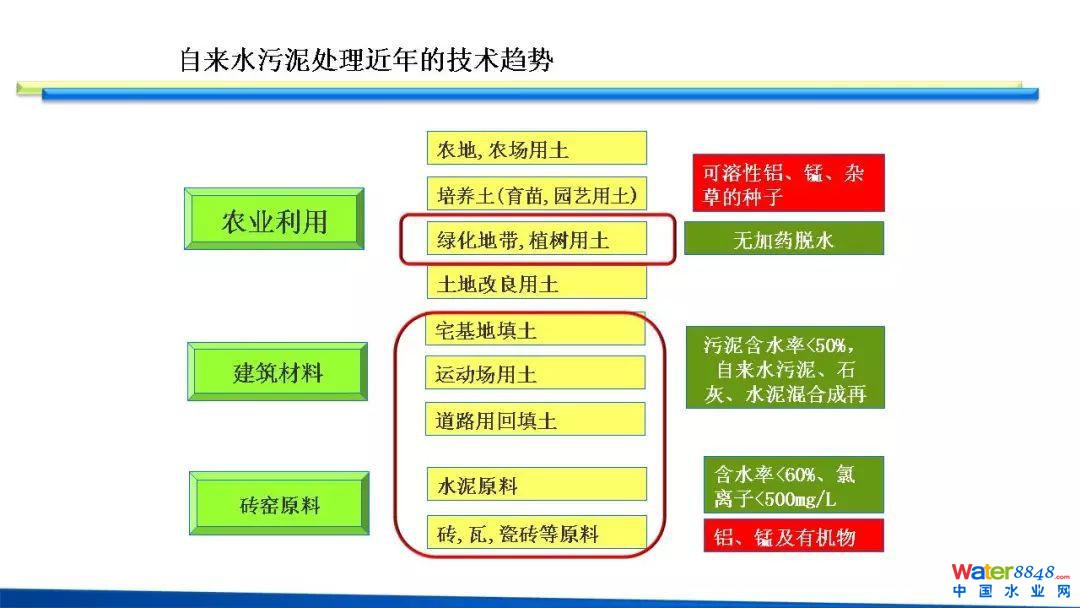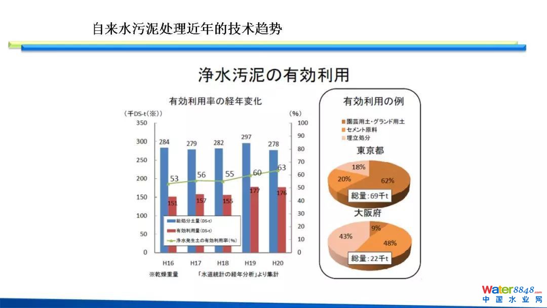 根據(jù)日本水道協(xié)會資料,2008年日本凈水絕干污泥量27.8萬噸,污泥資源化利用率63%(東京都:園藝用土、回填土62%、水泥原料20%、填埋18%;大阪府:園藝回填土9%、水泥原料48%、填埋43%)。