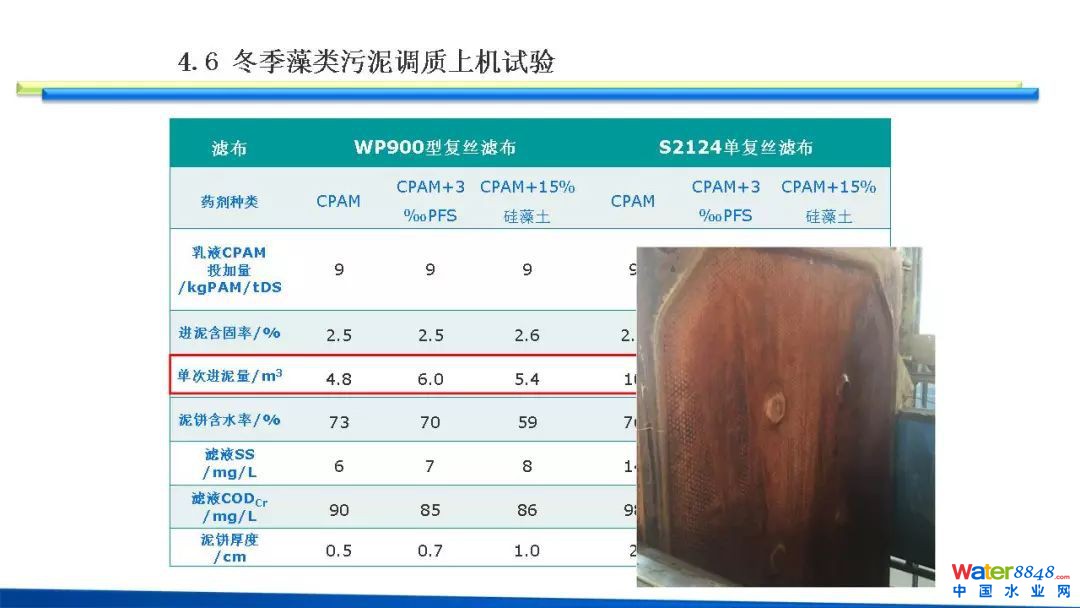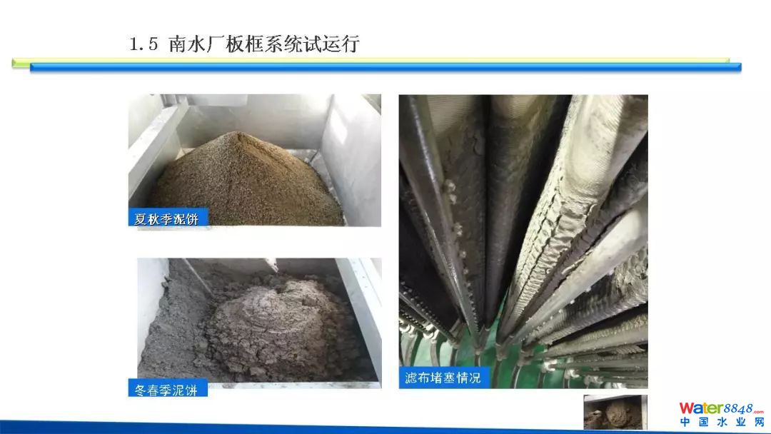 在試運行過程中,受到青草沙水庫原水季節(jié)性的藻類及冬季泥溫低的影響,造成在無加藥情況下夏季泥餅厚度2-3mm,無法達到設(shè)計處理量,冬季泥餅無法成行堵塞濾布,嚴重影響了板框機的處理能力及效果。在日本是通過污泥加溫,降低污泥粘度,提高過濾效果,但國內(nèi)水廠很少有外部熱源,單獨上設(shè)備加熱污泥成本太高。