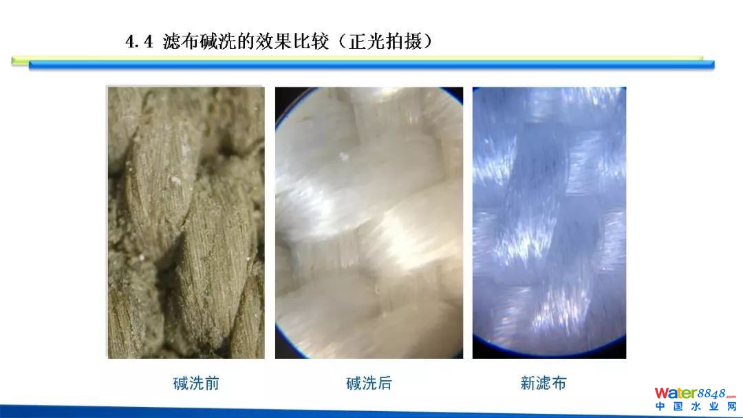 將堵塞濾布、堿洗濾布、新濾布放大60倍,能清晰發(fā)現(xiàn)通過化學(xué)清洗系統(tǒng)高壓清洗,濾布透氣度基本恢復(fù)。