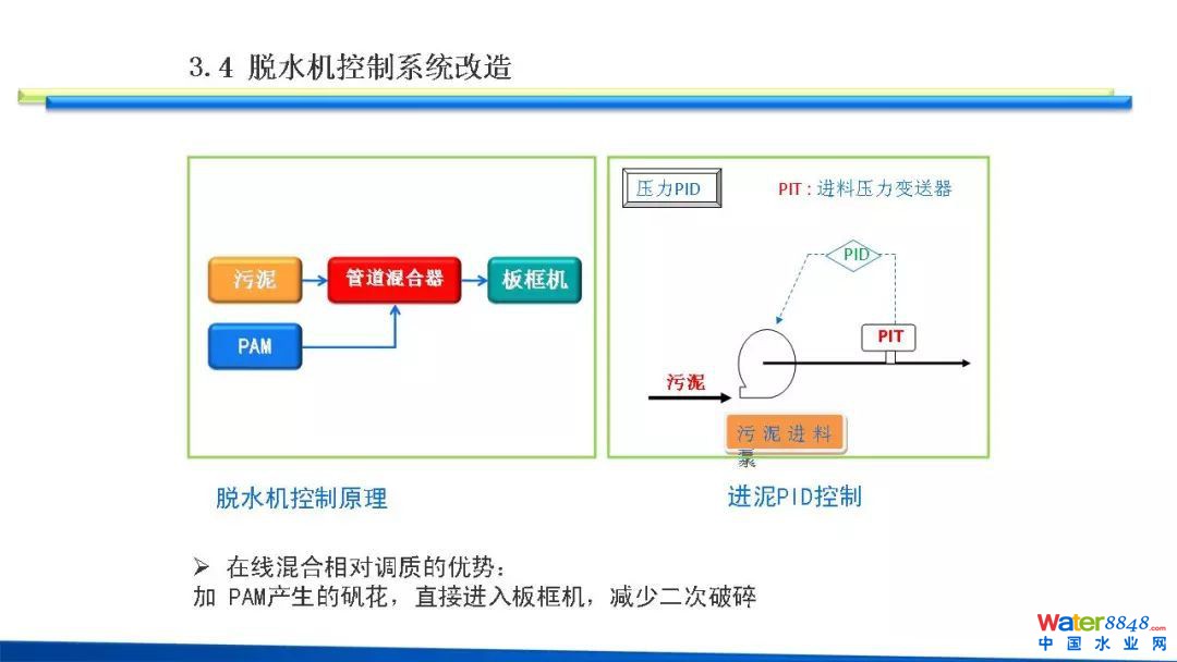 根據(jù)藥劑篩選及板框小試實驗情況,我們對原板框機新增加藥系統(tǒng),采用在線混合方式進行加藥,避免傳統(tǒng)調(diào)質(zhì)池長時間攪拌造成礬花二次破碎,提高板框機處理效率,進泥按壓力PID控制。