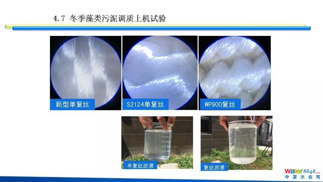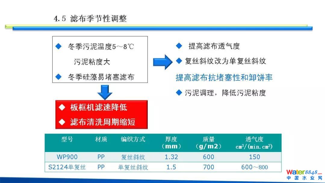 由于冬季原水溫度降低,泥溫只有5-8℃,污泥粘度增大,冬季污泥中以硅藻為主容易堵塞濾布清洗周期由原先1周降低至2-3。采取如下措施:一是提高濾布透氣度(透氣度150提高至600-800):二是將原有復(fù)絲斜紋為單復(fù)絲斜紋編織,單絲紗是由合成纖維制成的單根的連續(xù)長絲,用這種紗線織出的濾布表面光滑平整,孔隙分布均一,不易被堵塞,但單絲濾布容易拉伸變形,故采用單絲和復(fù)絲斜紋編織的濾布,提高濾布的抗拉伸性能、抗堵塞性三是進行污泥調(diào)質(zhì)試,提高板框機濾速,降低污泥含水率。