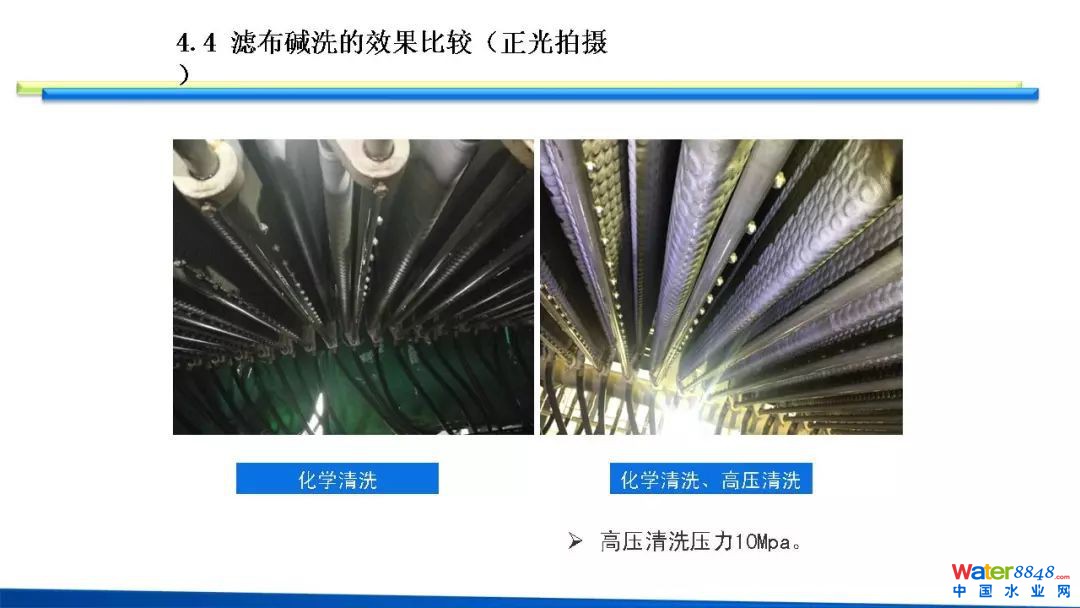 ISDC-H型濾布行走式板框脫水機沖洗壓力只有8kg,化學(xué)浸泡后,板框清洗系統(tǒng)無法有效清布無機性堵塞物質(zhì),必須輔助人工高壓沖洗(10MPa),濾布才能洗白恢復(fù)透氣度