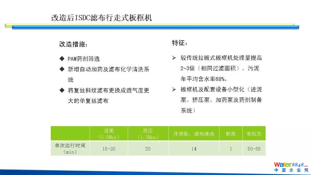 鑒于離心機及傳統(tǒng)板框機工藝缺陷,在項目設(shè)計時降低污泥含水率,減少污泥調(diào)質(zhì)藥劑,提高污泥資源利用范圍,項目采用了日本石垣的ISDC-H型濾布行走式板框機(461.5m濾板),單臺過濾面積167m2,濾室容積2146L。單臺設(shè)備設(shè)計污泥處理量5tDS/d。