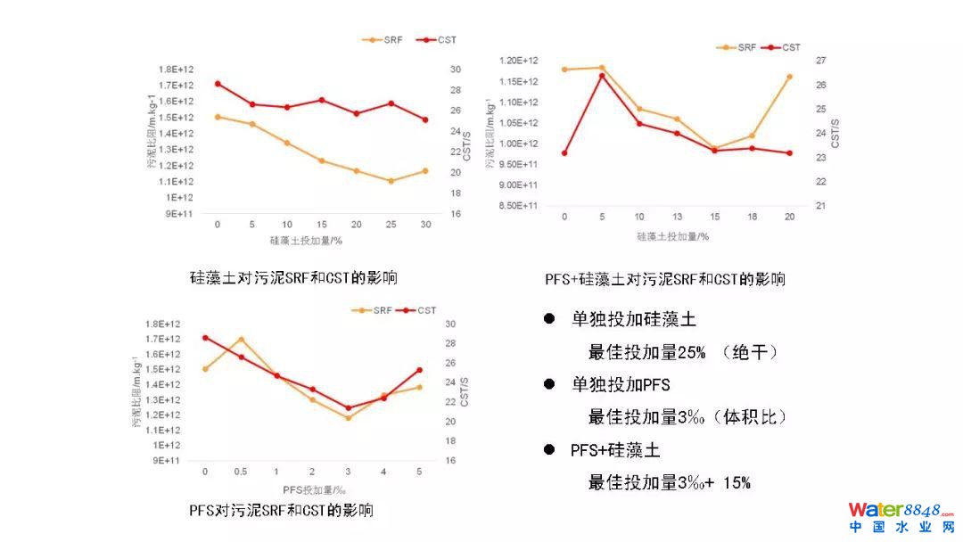 同時利用硅藻土多孔性、滲透性及PFS的混凝作用對污泥進行調(diào)質(zhì),單獨投加硅藻土最佳投加量25% ;單獨投加PFS最佳投加量3;PFS協(xié)同硅藻土最佳投加量3+ 15% 原泥比阻1.5*1012m/kgPFS+硅藻土PFS 9.89*1011m/kgCST30降至23。(比阻小于1×1011m/kg的污泥易于脫水,大于1×1013m/kg的污泥難以脫水)。