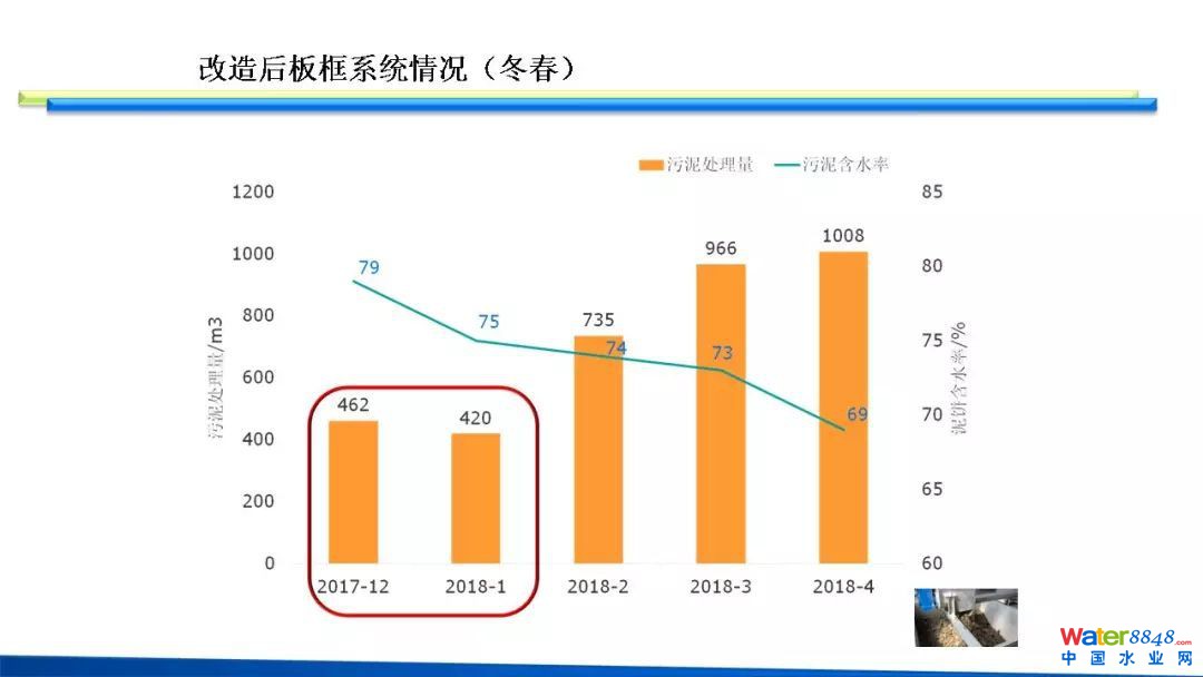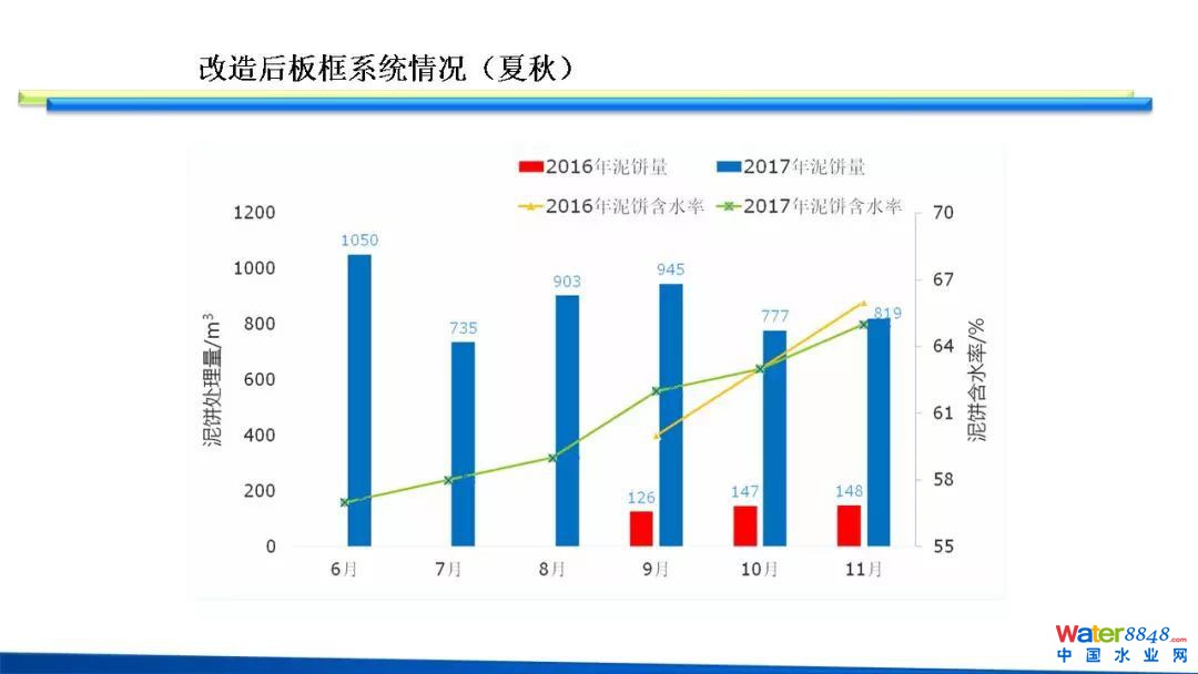 該項目20169月開始試運行無加藥脫水,201715月進行加藥系統(tǒng)及濾布清洗系統(tǒng)改造,20176月正式運行,板框機處理效率大幅提升,較2016年夏秋季同期不加藥脫板框脫水系統(tǒng)處理量增加約6倍。