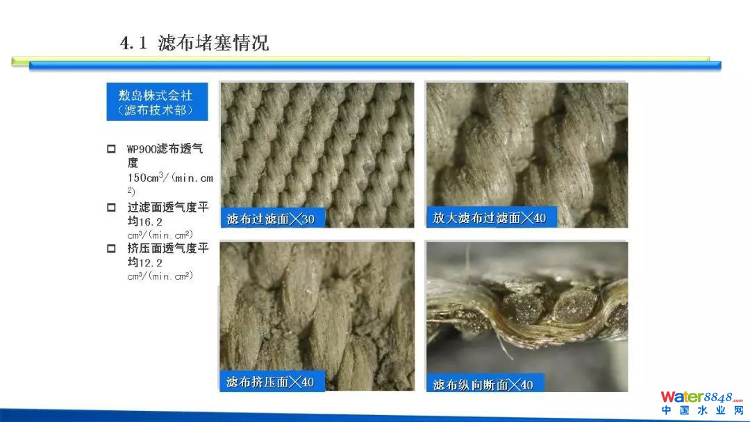 上圖是采用WP900型斜紋復(fù)絲編織濾布,新濾布透氣度150,具有較高抗拉強度,防止濾布拉伸收縮變形后,濾布行走電機出現(xiàn)過載或濾布從導(dǎo)向輥脫落現(xiàn)象。但加藥脫水后濾布容易堵塞,我們委托日本敖島株式會社濾布技術(shù)部對堵塞濾布過濾面、擠壓面進行透氣度檢測,各做五組平行樣,過濾面透氣度平均16.2 cm3/cm2/min,擠壓面透氣度平均12.2cm3/cm2/min,濾布堵塞嚴重。