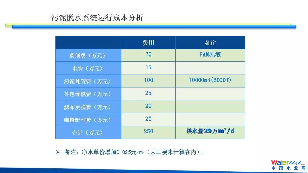 根據(jù)20175-20184月運行數(shù)據(jù)統(tǒng)計,全年運行費用250萬(29m3/d),凈水單價增加0.025/m3