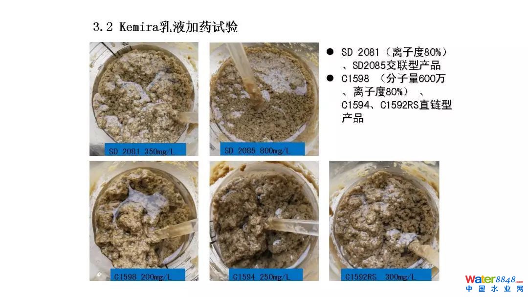 我們又篩選了kemira的乳液,選擇交聯(lián)和支鏈結(jié)構(gòu)的乳液產(chǎn)品,最終根據(jù)礬花大小、濾液清澈度及藥劑投加量情況選擇C1598 (分子量600萬、離子度80%),藥劑分子量低,粘度小,過量投加也不會堵塞濾布。