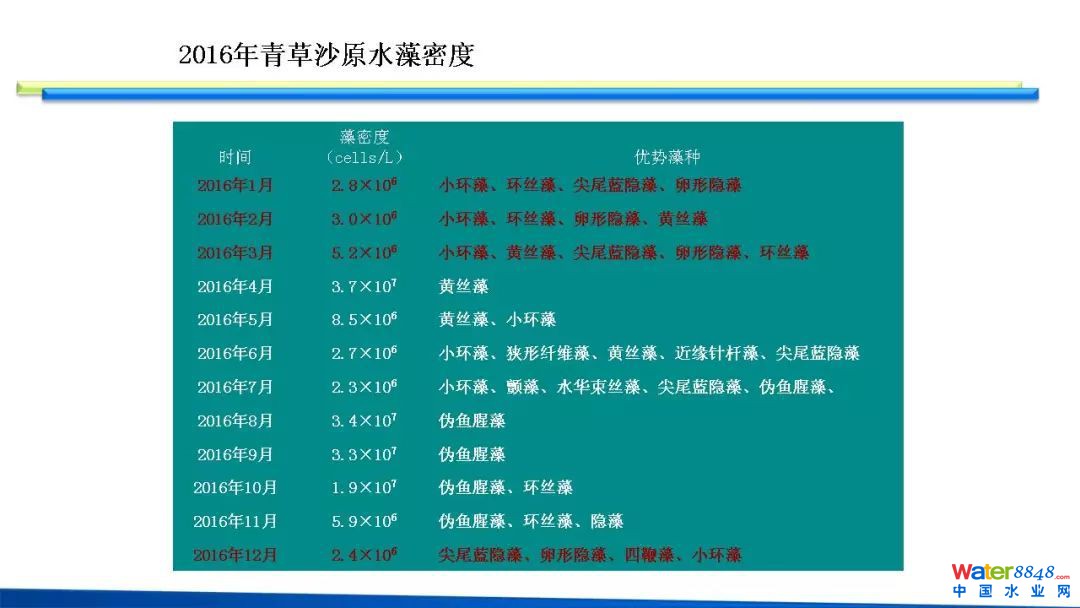2016年青草沙藻類為例,夏季主要以藍綠藻類的偽魚腥藻為主,冬季主要以硅藻類的小環(huán)藻為主。