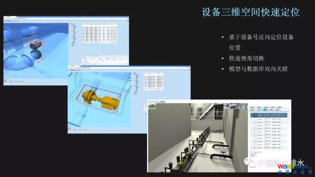 除了可以通過(guò)三維模型查詢其附屬信息外,我們有時(shí)也需要根據(jù)提供的一部分信息反向定位三維模型,從而查找更多的相關(guān)信息。比如通過(guò)提供的設(shè)備號(hào),我們可以快速定位該設(shè)備的空間位置,并即時(shí)切換視角。這為生產(chǎn)運(yùn)行過(guò)程中的故障應(yīng)急響應(yīng)提供了技術(shù)基礎(chǔ)。
