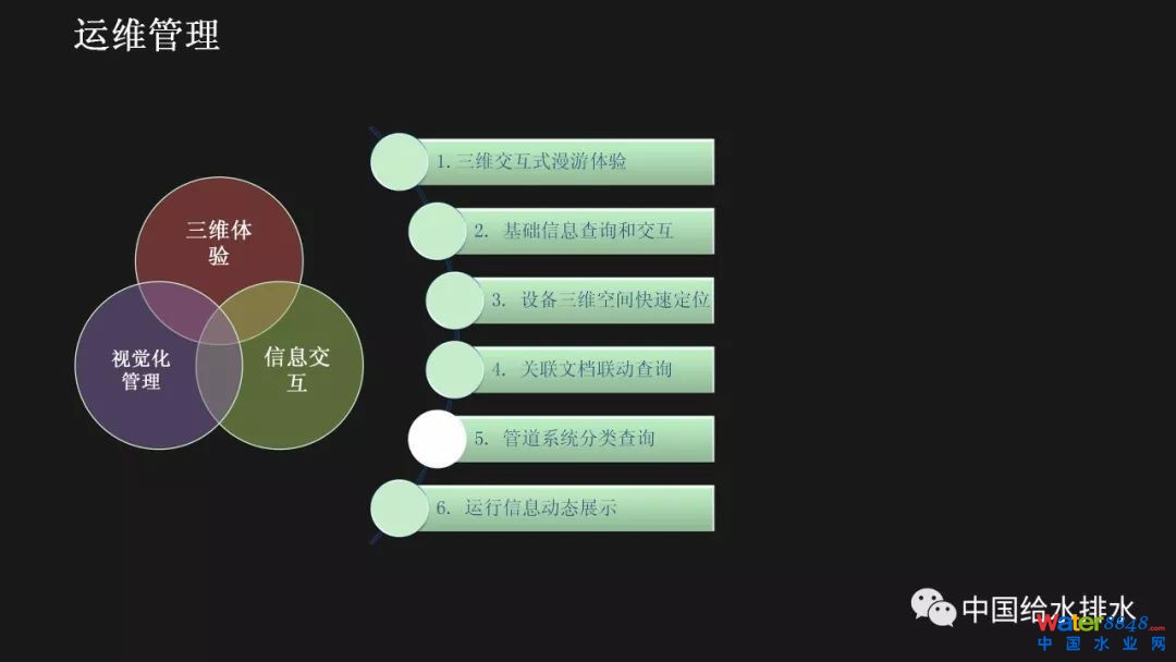 運(yùn)營(yíng)階段則是工程實(shí)體發(fā)揮功能和全生命周期中最長(zhǎng)的階段,這個(gè)階段的管理工作同樣非常重要。BIM服務(wù)于運(yùn)維,已經(jīng)發(fā)展成為一個(gè)相對(duì)獨(dú)立的研究方向,BIM和設(shè)施管理相結(jié)合的研究越來(lái)越受到關(guān)注,這也正是智慧水務(wù)建設(shè)的一個(gè)重要方面,即對(duì)供水設(shè)施的運(yùn)營(yíng)進(jìn)行科學(xué)化的管理。