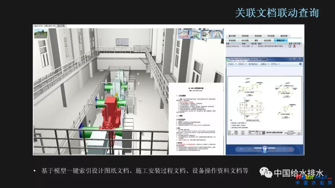 除了基本的設(shè)備信息之外,還可以將設(shè)計(jì)、施工、安裝過(guò)程中相關(guān)技術(shù)文檔與工程實(shí)體關(guān)聯(lián),讓相關(guān)的信息和資料都通過(guò)三維模型建立聯(lián)系,避免工程資料的分散存儲(chǔ)、查找不便。如圖對(duì)某臺(tái)水泵可一鍵索引其水泵基礎(chǔ)設(shè)計(jì)圖、水泵安裝技術(shù)文檔等。從某種程度上講,這才是達(dá)成了將工程所有信息集成在一起的目的。