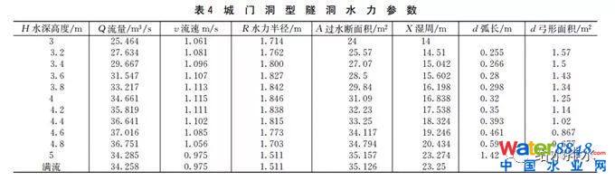 計算過程中對于斷面不規(guī)則的隧洞部分,首先進行了不同流量下的標準水深計算,設(shè)計采用粗糙度n=0.013 5,i=0.1‰進行計算,對于頂部不規(guī)則部分進行水力半徑計算,計算表如表4,分別得出對應(yīng)的流量和流速,用于疊加工況水力計算。