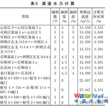 計算時由干渠末端水量和斷面尺寸倒推上游水位,對于矩形與城門洞型隧洞漸變段考慮水頭損失和因流態(tài)變化產(chǎn)生的水躍或雍水造成水位變化。推算到渠道首部城門洞型時采用插值法確定水深,經(jīng)校核水深誤差在1%以內(nèi)。計算表結(jié)果如表6所示。