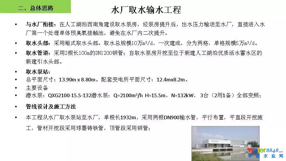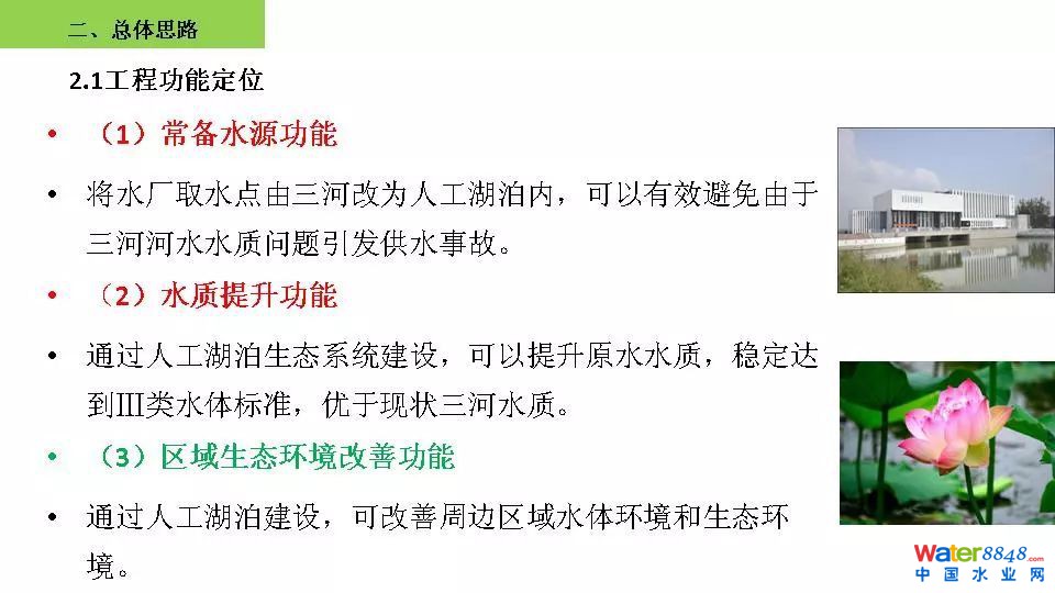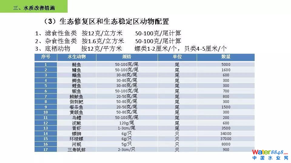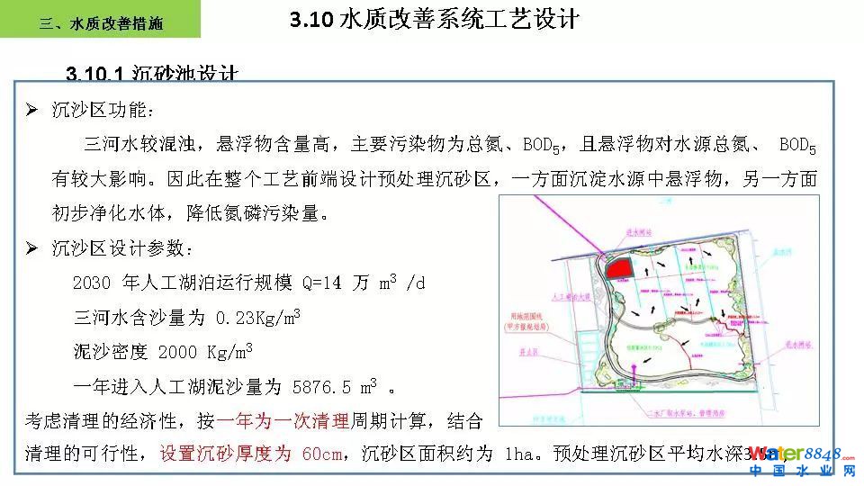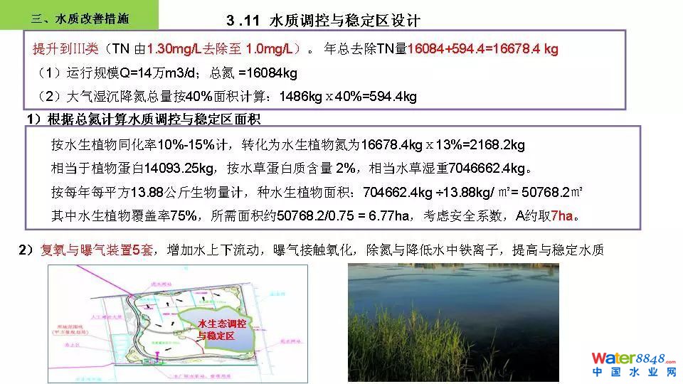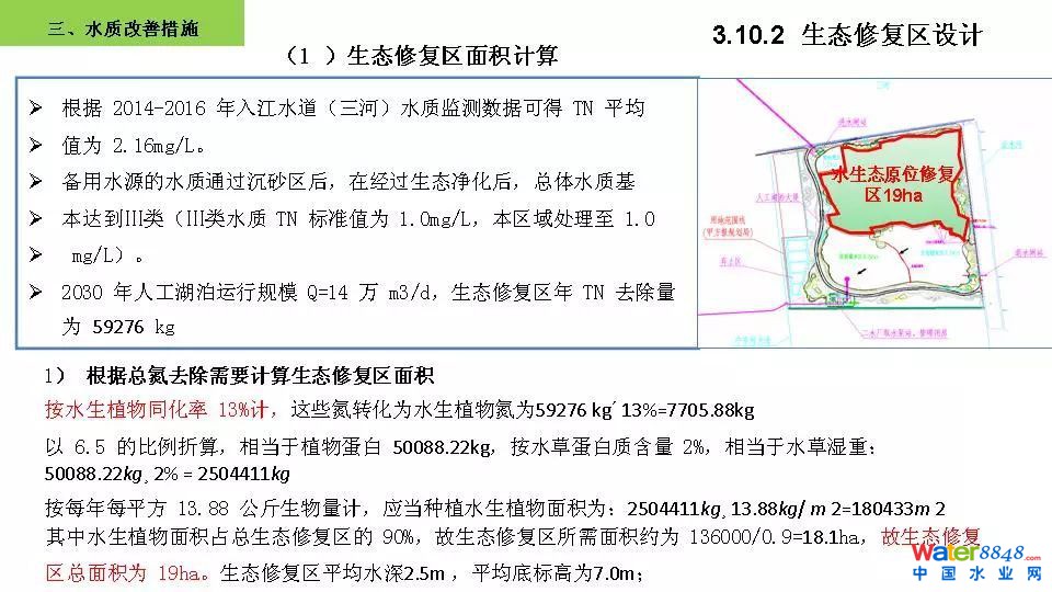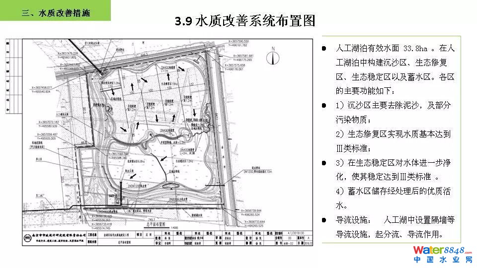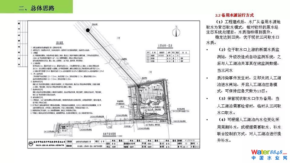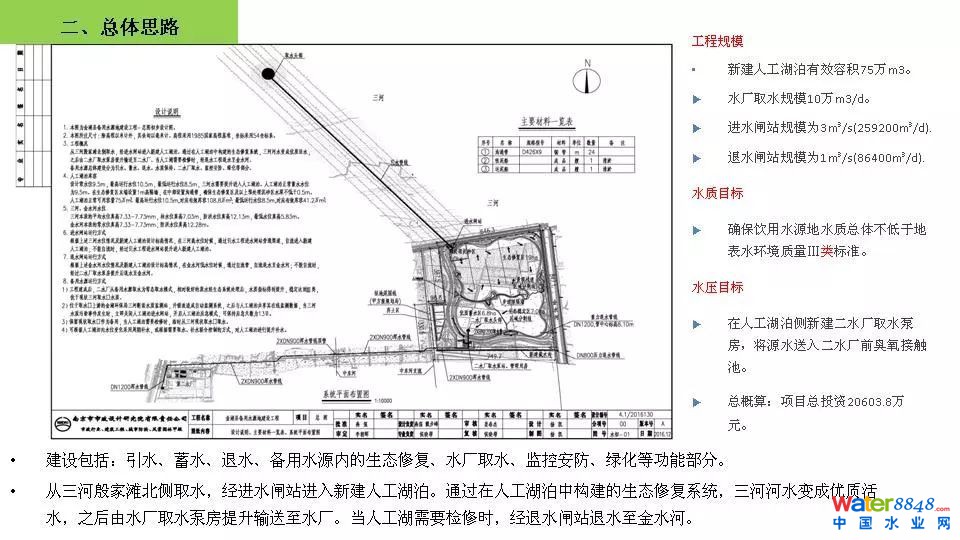 根據(jù)《淮安市水資源公報(2015年)》,2015年三河水質(zhì)狀況為Ⅲ類。但存在如下問題:行洪期間,三河水受上游來水污染,TN、糞大腸菌群、CODMn、BOD5等偏高,影響水廠正常運(yùn)行,一般持續(xù)3~5天左右;平時部分指標(biāo)超標(biāo)。為應(yīng)對三河突發(fā)事件,保證金湖供水安全,落實(shí)江蘇省關(guān)于構(gòu)建“雙重水源、雙重保障”的要求,保障城市持續(xù)發(fā)展,實(shí)施金湖縣備用水源建設(shè)工程是十分必要的。工程規(guī)模:新建人工湖泊有效容積75萬m3;水廠取水規(guī)模10萬m3/d;進(jìn)水閘站規(guī)模為3m³/s(259200m³/d);退水閘站規(guī)模為1m³/s(86400m³/d)。水質(zhì)目標(biāo):確保飲用水源地水質(zhì)總體不低于地表水環(huán)境質(zhì)量Ⅲ類標(biāo)準(zhǔn);水壓目標(biāo):在人工湖泊側(cè)新建二水廠取水泵房,將源水送入二水廠前臭氧接觸池。項(xiàng)目總投資為20603.8萬元。建設(shè)包括:引水、蓄水、退水、備用水源內(nèi)的生態(tài)修復(fù)、水廠取水、監(jiān)控安防、綠化等功能部分。報告分別從整體思路、水質(zhì)改善措施、管理維護(hù)措施、水質(zhì)改善技術(shù)等方面對該項(xiàng)目進(jìn)行了詳細(xì)介紹。