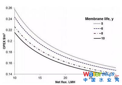 通過對主要參數(shù)的計算對比可以發(fā)現(xiàn),膜通量是OPEX中影響力最高的因子,因為它同時影響了單位能耗和膜更換的成本。