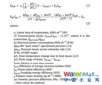 MSF和RO的能耗對比一般用以下公式進(jìn)行計算,其中公式(1)計算MSF熱法淡化的單位能耗,公式(2)則對應(yīng)RO的單位能耗。