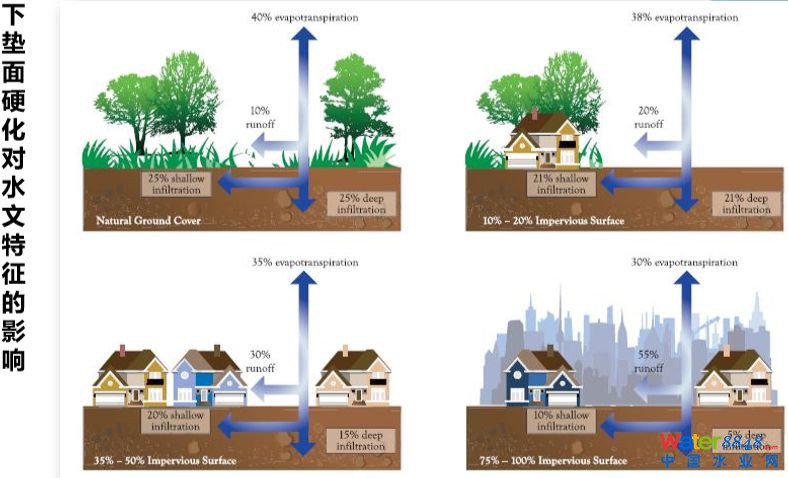 下墊面硬化是城市建設(shè)過(guò)程中所面臨的最大的問(wèn)題之一。硬化會(huì)破壞城市水系統(tǒng)的循環(huán),下圖表示不同硬化條件下,當(dāng)?shù)厮奶卣鞯淖兓闆r。從圖中可以看到隨著城市化的加深,不透水下墊面所占的比例越來(lái)越大,嚴(yán)重影響了當(dāng)?shù)氐乃h(huán)過(guò)程。造成的直接影響是地表徑流顯著增大,而滲透的地下水逐漸減少。隨之引發(fā)的是一系列的生態(tài)、環(huán)境、資源和安全問(wèn)題等。從海綿效應(yīng)的角度來(lái)看,這是由于當(dāng)?shù)刈匀画h(huán)境本身所固有的海綿效應(yīng)在人為建設(shè)過(guò)程受到干擾,因此失效了。