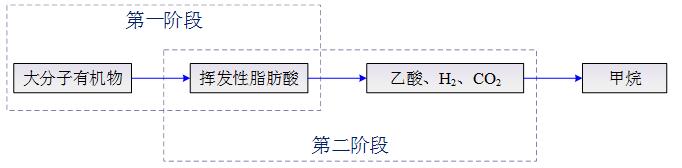 厭氧過程一般分為三個階段[2]:水解發(fā)酵階段、產(chǎn)氫產(chǎn)乙酸階段、產(chǎn)甲烷階段。水解酸化就是將厭氧過程控制在反應(yīng)速率較快的第一階段和第二階段,即將大分子雜環(huán)的不溶性有機(jī)物水解為小分子的可溶性有機(jī)物,將難以生物降解的大分子物質(zhì)轉(zhuǎn)化為易生物降解的小分子有機(jī)物質(zhì)的過程,如圖1的第一階段和第二階段: