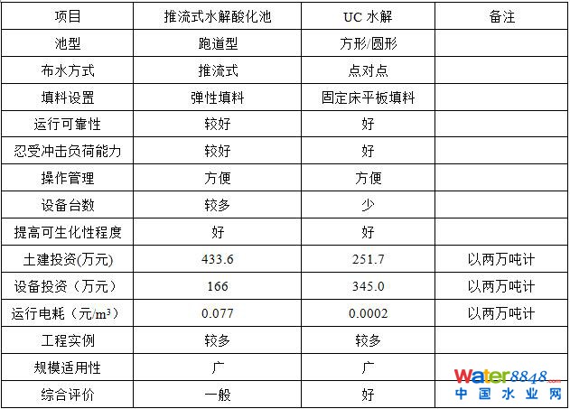 根據(jù)對2個比選方案的定性及定量比較結(jié)果來看,UC水解工藝占有明顯優(yōu)勢,是適合工程應(yīng)用的水解酸化技術(shù)。