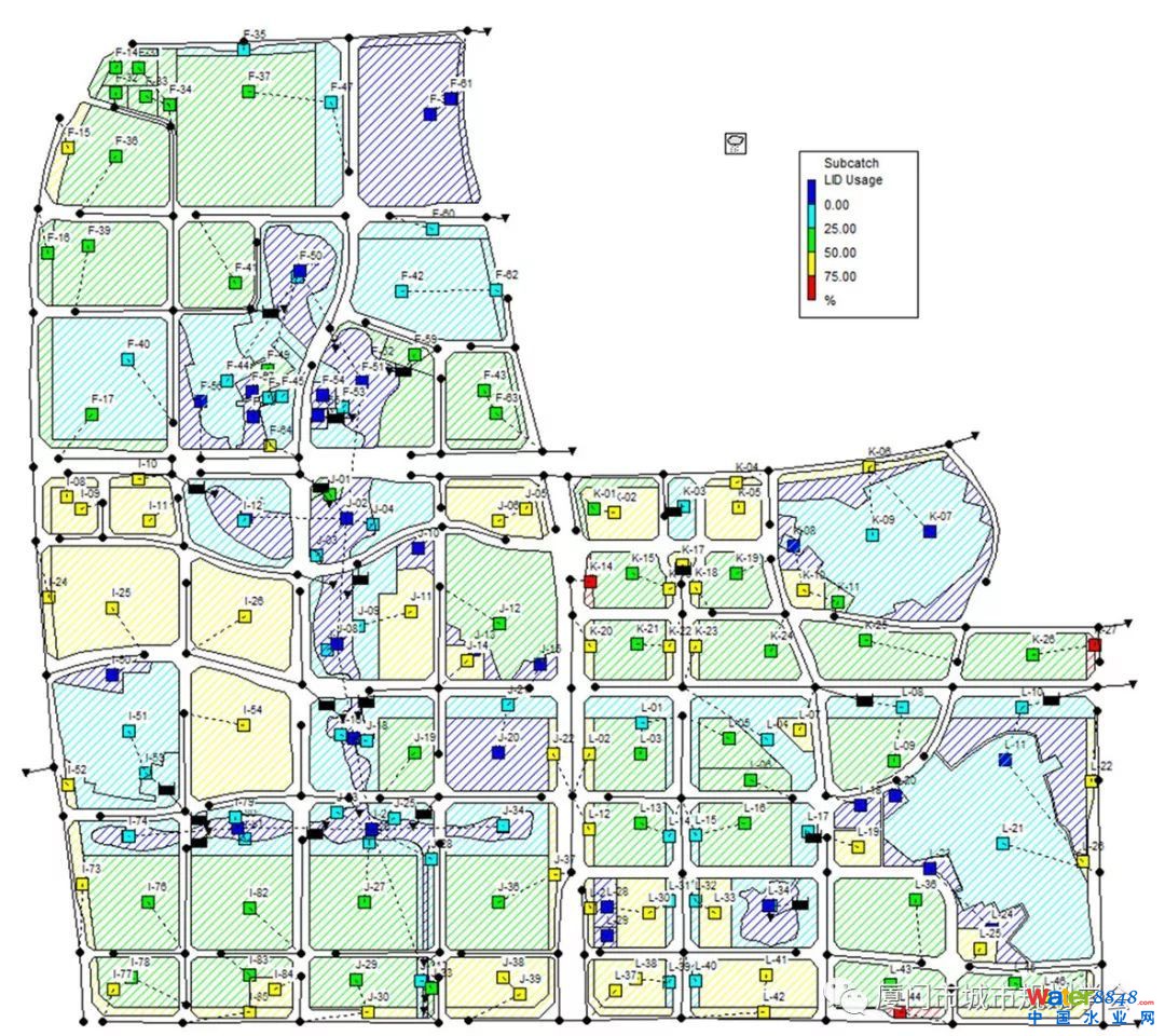 該規(guī)劃從流域、管控單元和地塊三個(gè)層次進(jìn)行了SWMM模型指標(biāo)分解,同時(shí)選取了典型的建筑小區(qū)、道路廣場(chǎng)、綠地系統(tǒng)、城市水系四個(gè)系統(tǒng)進(jìn)行詳細(xì)設(shè)計(jì),很好地銜接規(guī)劃與設(shè)計(jì)環(huán)節(jié),并進(jìn)一步明晰建設(shè)要點(diǎn),解決規(guī)劃指標(biāo)落地難的問題,對(duì)海綿城市建設(shè)具有十分重要的意義。