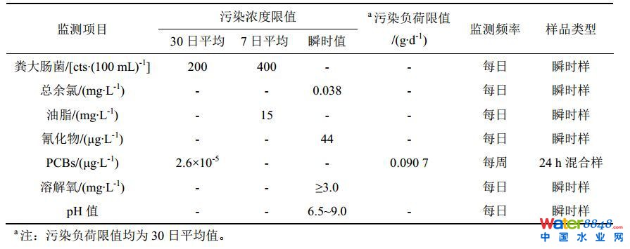 對于二級處理后尾水的水質(zhì)監(jiān)測點(diǎn)049B,排放許可證不僅對尾水污染物的濃度進(jìn)行控制,對水體造成的污染物負(fù)荷也有限制。其污染物控制指標(biāo)及排放限值如表2所示。除上述許可證規(guī)定的污染物排放限值外,底特律污水處理廠還須向環(huán)境質(zhì)量部門報(bào)告監(jiān)測點(diǎn)049B每日的處理水量、CBOD5濃度、TP濃度、氨氮濃度、總汞濃度等數(shù)據(jù),以及每月水量、氨氮濃度、總汞濃度及負(fù)荷的日平均值。