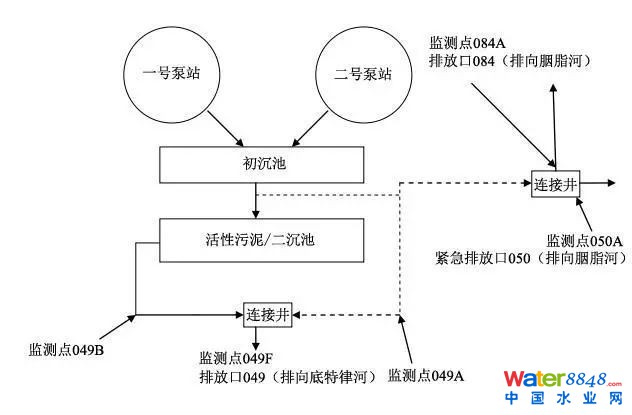 如圖2所示,底特律污水處理廠的尾水排放口共有三個(gè),分別為排放口049、排放口050和排放口084,其中排放口049通向底特律河,排放口050和排放口084通向胭脂河。